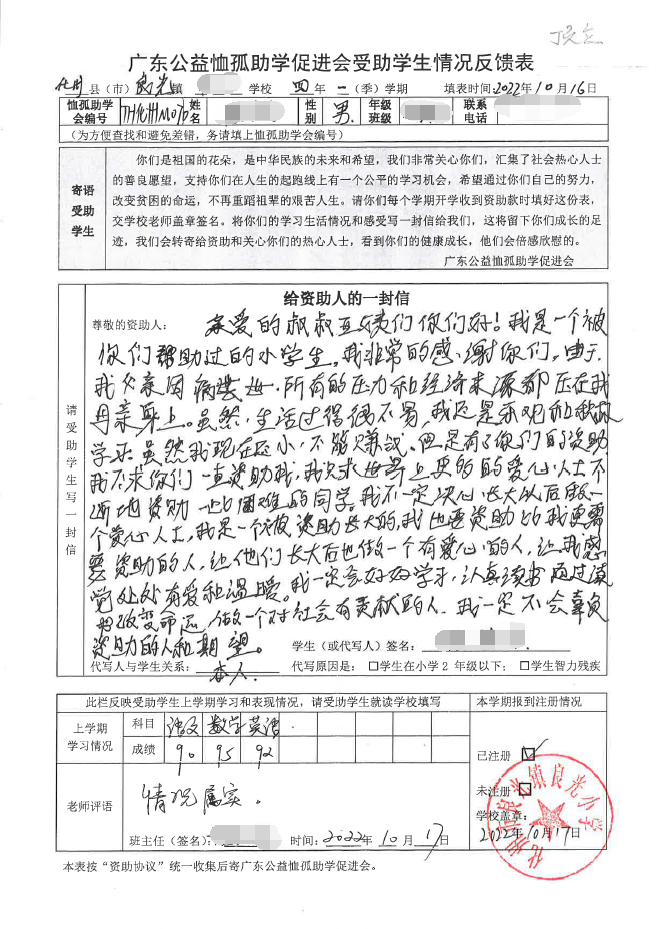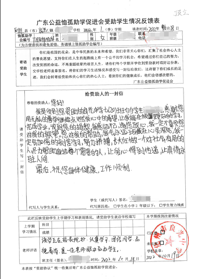 2022年7月,公司了解到廣東公益恤孤助學(xué)促進(jìn)會(huì)舉辦慈善助學(xué)活動(dòng)之后,發(fā)起了公司內(nèi)部慈善捐款活動(dòng),員工們積極參與,紛紛捐款,向有需要的學(xué)生奉獻(xiàn)愛心,向他們表達(dá)一份關(guān)愛。也許我們的愛心微不足道,但卻緩解了他們?cè)趯W(xué)業(yè)上一定程度的經(jīng)濟(jì)壓力,改善了他們的學(xué)習(xí)和生活環(huán)境,也給他們帶來了希望。近期,廣東公益恤孤助學(xué)促進(jìn)會(huì)將學(xué)生情況反饋表及受助學(xué)生對(duì)捐助人的一封信郵寄到公司,反饋了受助學(xué)生的學(xué)習(xí)生活情況,反饋表及信函里記錄著受助學(xué)生對(duì)學(xué)習(xí)的熱愛,也表達(dá)著他們對(duì)捐助人的感激之情,可以說我們小小的舉動(dòng)給他們帶來了莫大的支持。